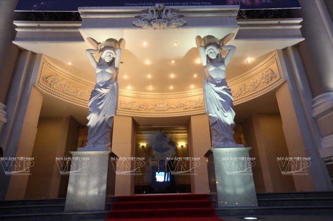 Tượng nữ thần được đắp nổi ngay trước sảnh của nhà hát.
